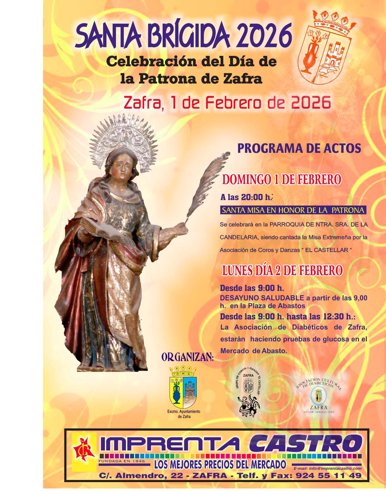 Zafra celebrará los días 1 y 2 de febrero el Día de Santa Brígida, patrona de la ciudad, con un programa de actos que une tradición, cultura y salud.