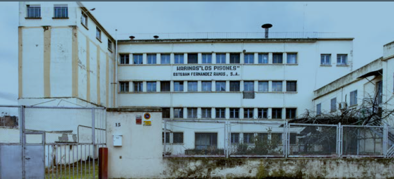 La fábrica de harinas «Los Pisones. Esteban Fernández Ramos» es un compacto edificio situado al final de la calle doctor Fleming, frente a la entrada de Valorio.